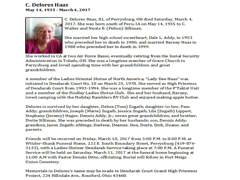 Haas, C Delores, Witzler Shank Funeral Home, Perrysburg, OH
