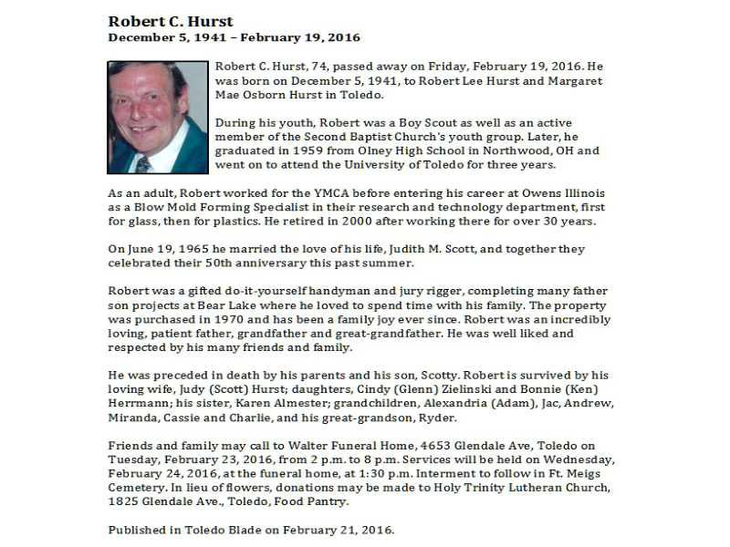 Hurst, Robert, Walter Funeral Home, Toledo, OH Published in Toledo Blade; 02/21/2016