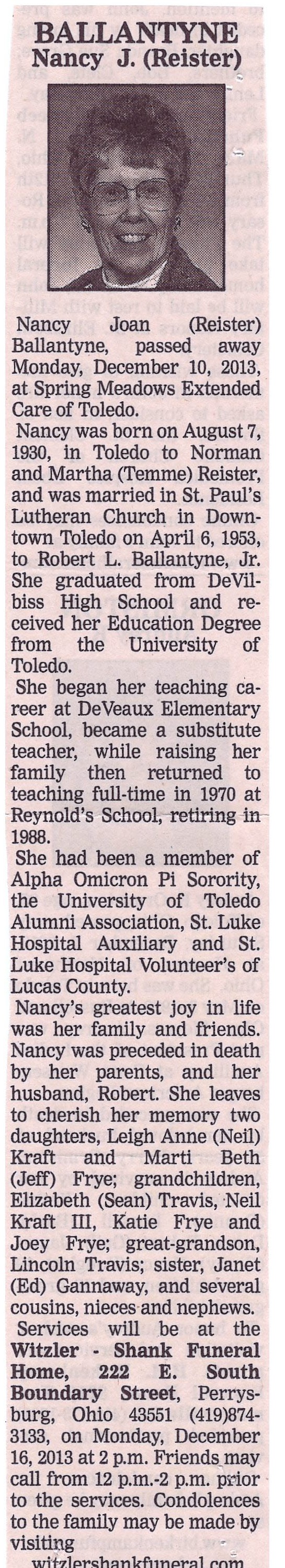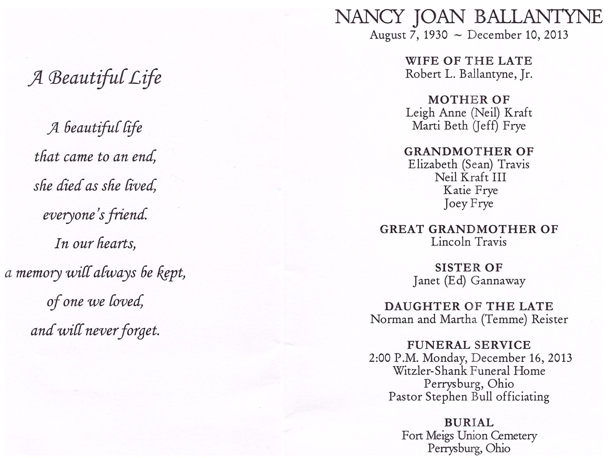 Ballantyne, Nancy, Witzler Shank Funeral Home,Perrysburg, OH