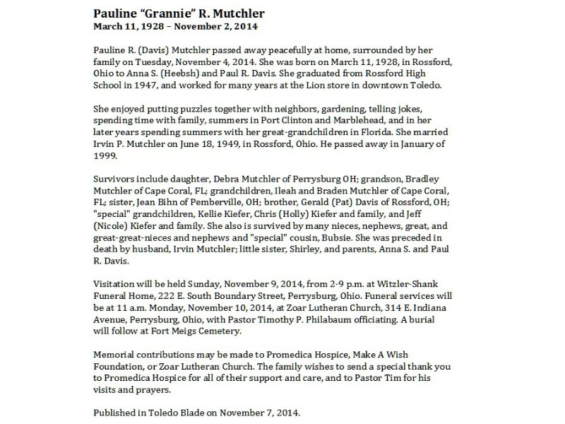 Mutchler, Pauline, Witzler Shank Funeral Home