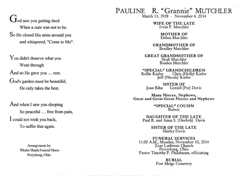 Mutchler, Pauline - Remembrance Card, Witzler Shank Funeral Home