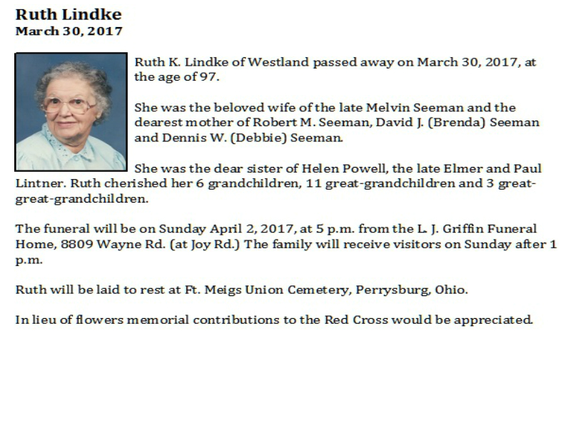 Lindke, Ruth, LJ Griffin Funeral Home, Livonia, MI
