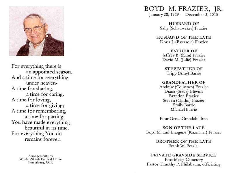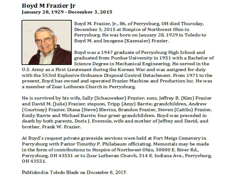 Frazier Jr, Boyd - Obituary, Witzler Shank Funeral Home, Perrysburg, OH Published in Toledo Blade; 12/06/2015