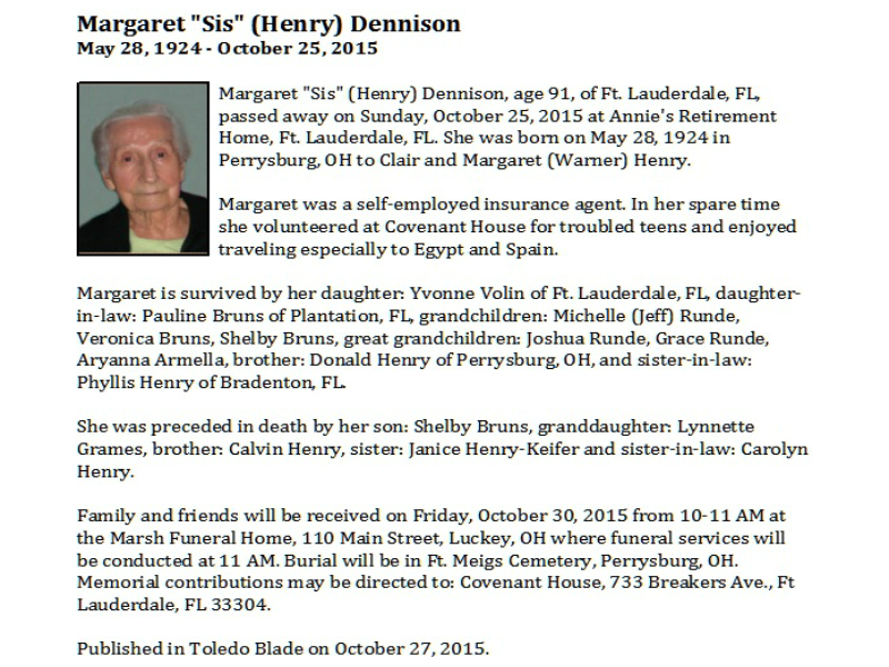 Dennison, Margaret, Marsh Funeral Home, Luckey, OH Published in Toledo Blade; 10/27/215