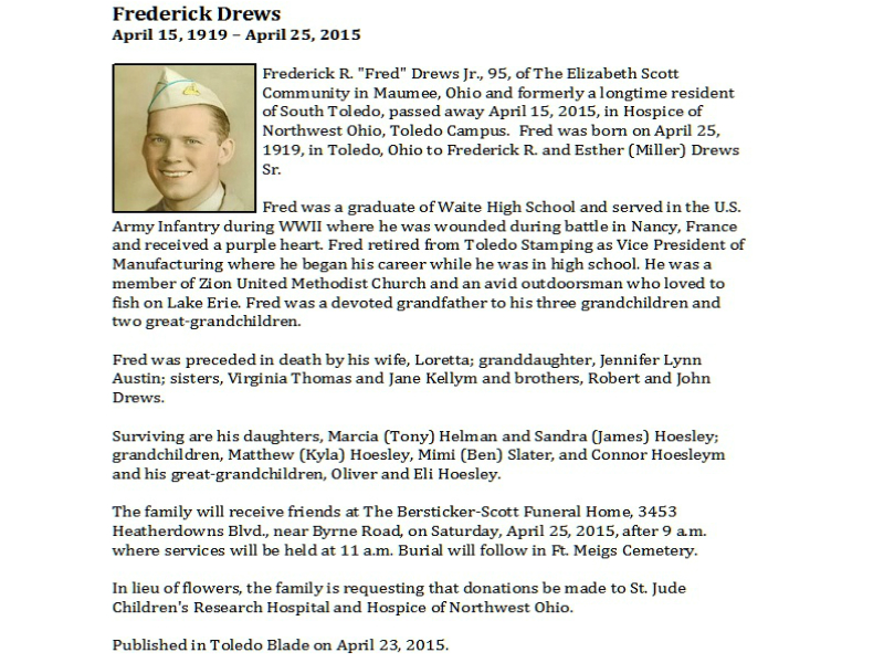 Drews, Frederick, Bersticker Scott Funeral Home, Toledo, OH Published in Toledo Blade; 04/23/2015