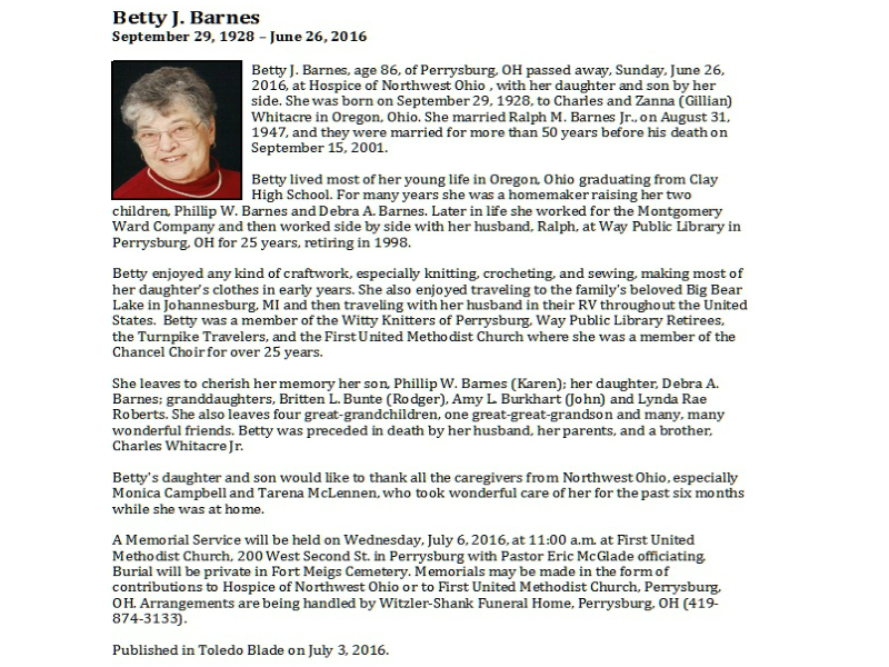 Barnes, Betty, Witzler Shank Funeral Home, Perrysburg, OH Published in Toledo Blade; 07/03/2016