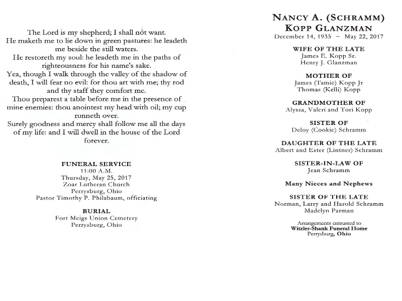 Kopp Glanzman, Nancy, Witzler Shank Funeral Home, Perrysburg, OH