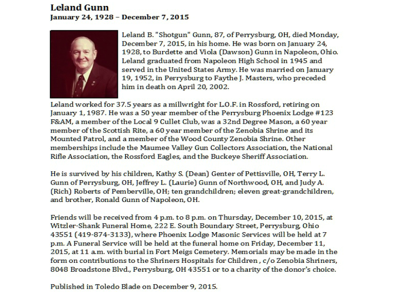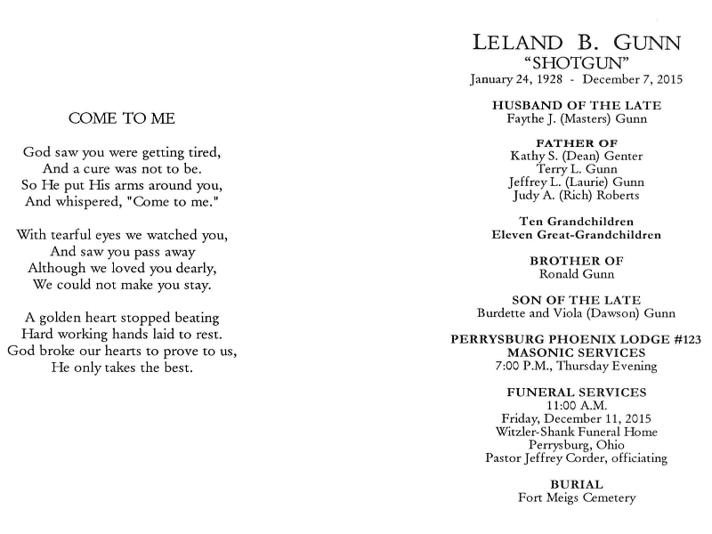 Gunn, Leland - Obituary, Witzler Shank Funeral Home, Perrysburg, OH Published in Toledo Blade; 12/09/2015