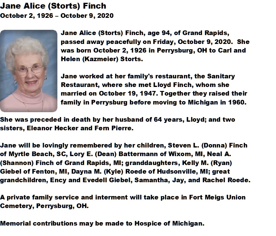 Finch, Jane - Obituary, Stroo Funeral Home, Grand Rapids, MI