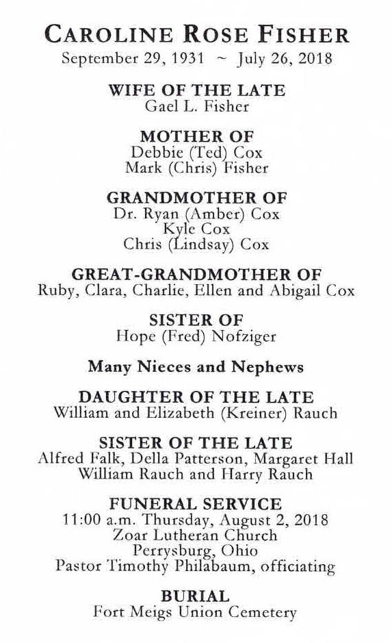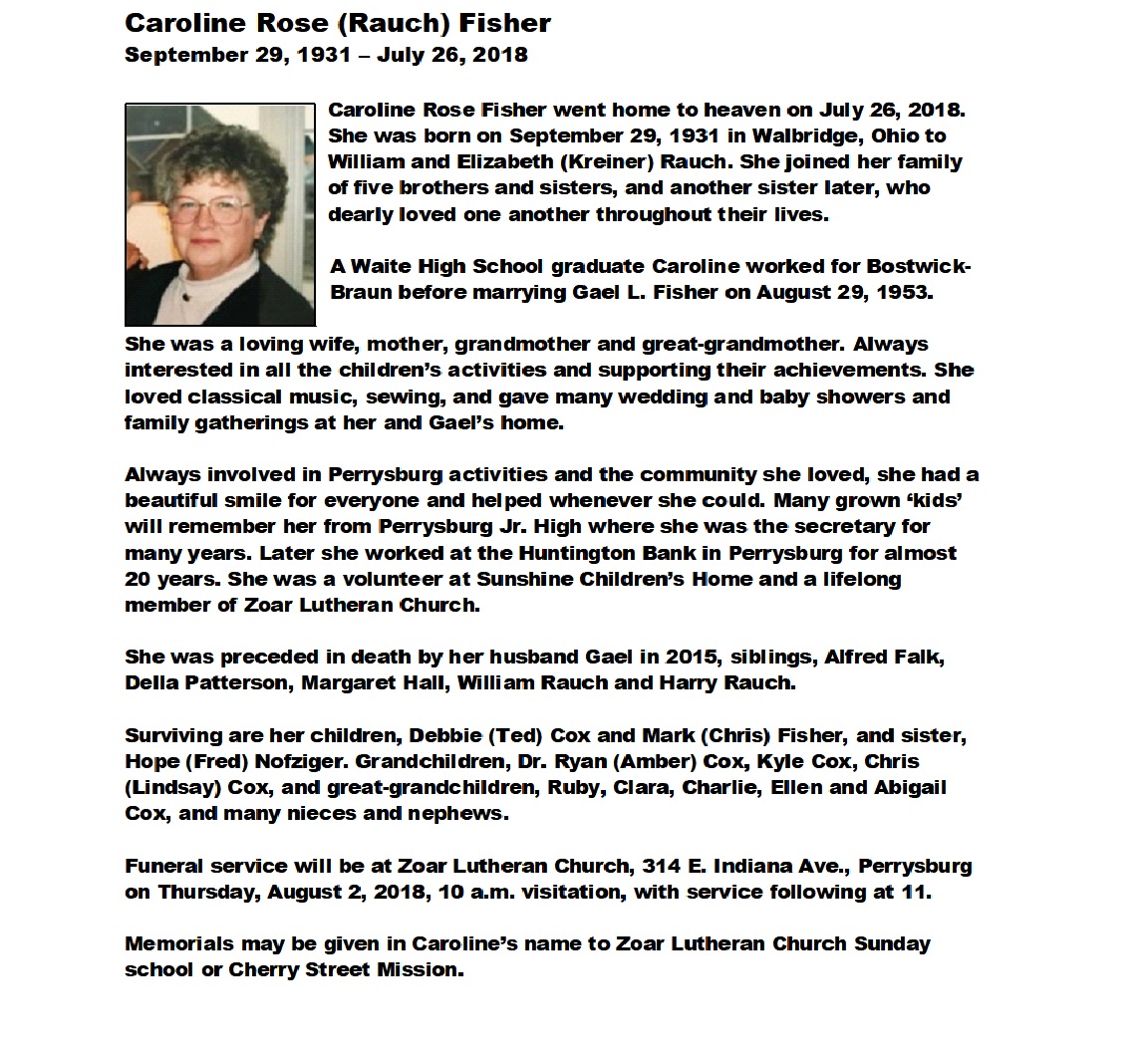 Fisher, Caroline - Obituary, Witzler Shank Funeral Home, Perrysburg, OH