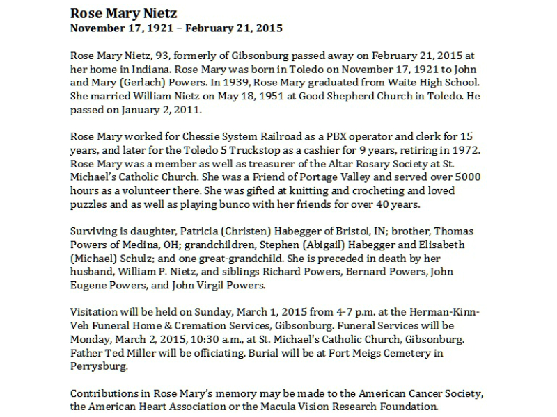 Nietz, Rose Mary, Herman-Kinn Funeral Home, Gibsonburg, OH Published in Toledo Blade; 02/28/2015