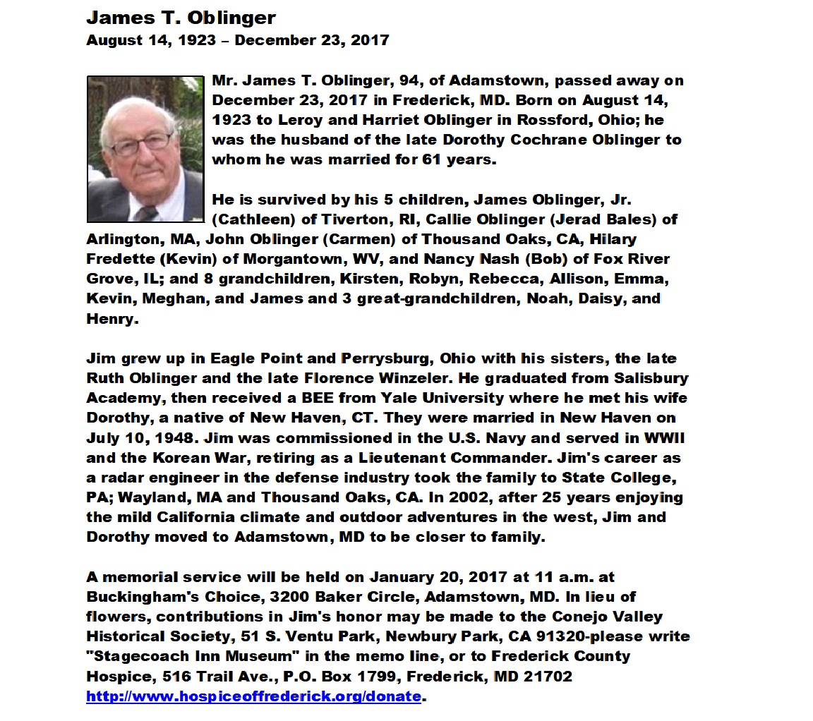 Oblinger, James T, Stauffer Funeral Home, Maryland