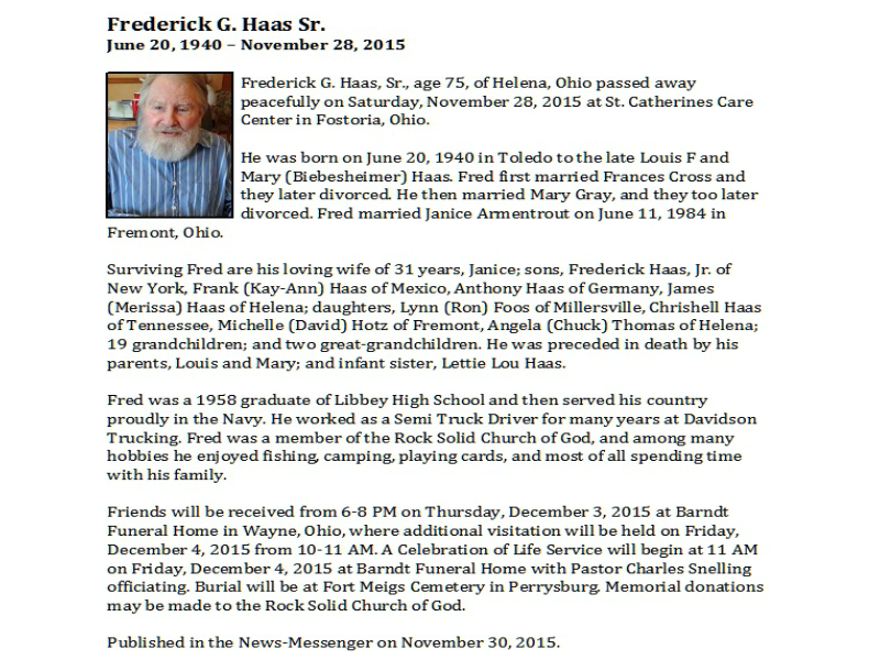 Haas Sr, Frederick, Barndt Funeral Home, Wayne, OH Published in News-Messenger; 11/30/2015