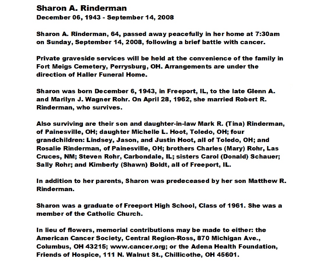 Rinderman, Sharon, Haller Funeral Home, Chillicothe, OH
