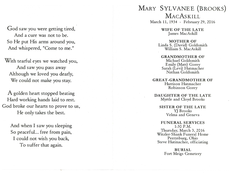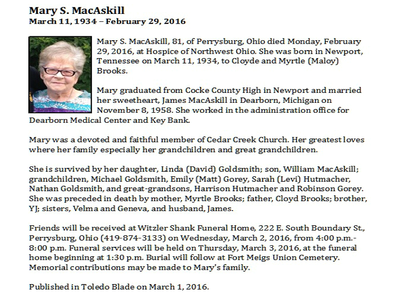 MacAskill, Mary - Obituary, Witzler Shank Funeral Home, Perrysburg, OH Published in Toledo Blade; 03/01/2016