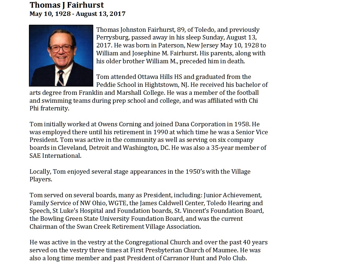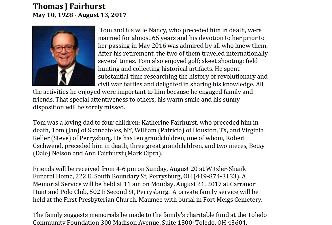 Fairhurst, Thomas - Obituary pg 1, Witzler Shank Funeral Home, Perrysburg, OH