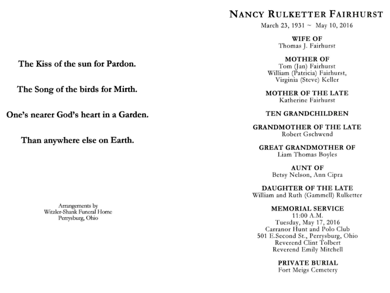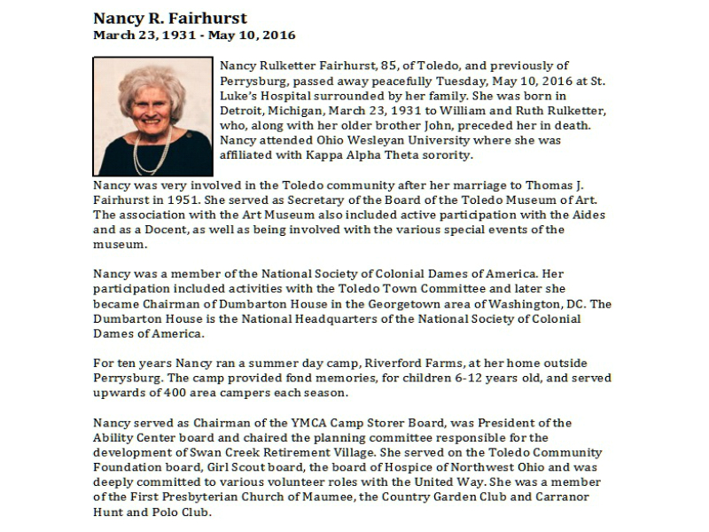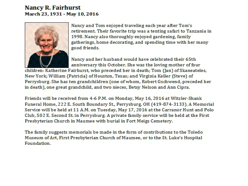 Fairhurst, Nancy - Obituary pg 2, Witzler Shank Funeral Home, Perrysburg, OH Published in Toledo Blade; 05/14/2016