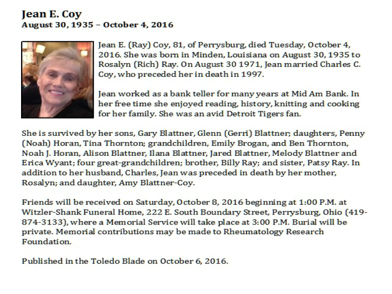 Coy, Jean - Obituary, Witzler Shank Funeral Home, Perrysburg, OH Published in Toledo Blade; 10/06/2016
