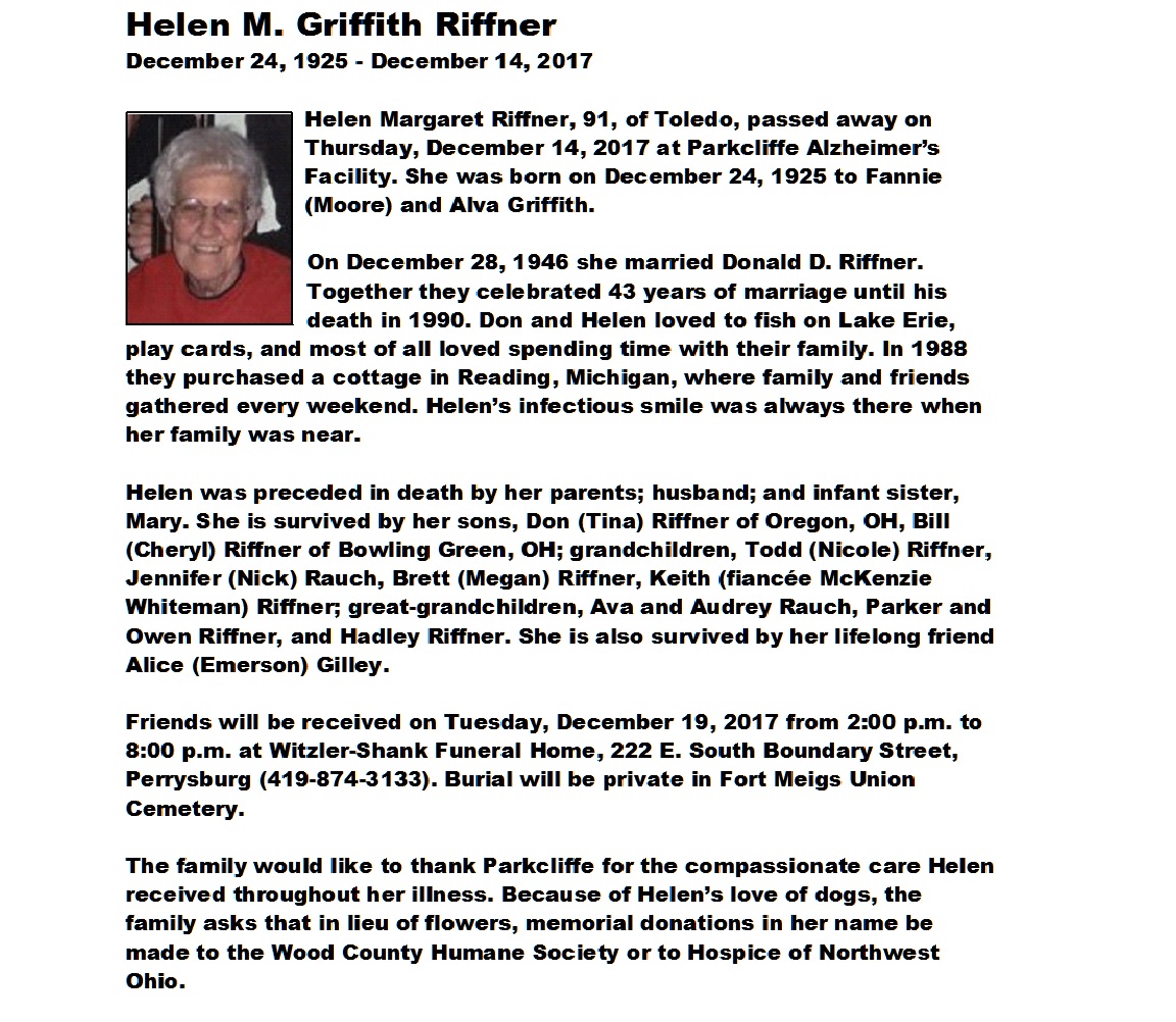 Riffner, Helen - Obituary, Witzler Shank Funeral Home, Perrysburg, OH