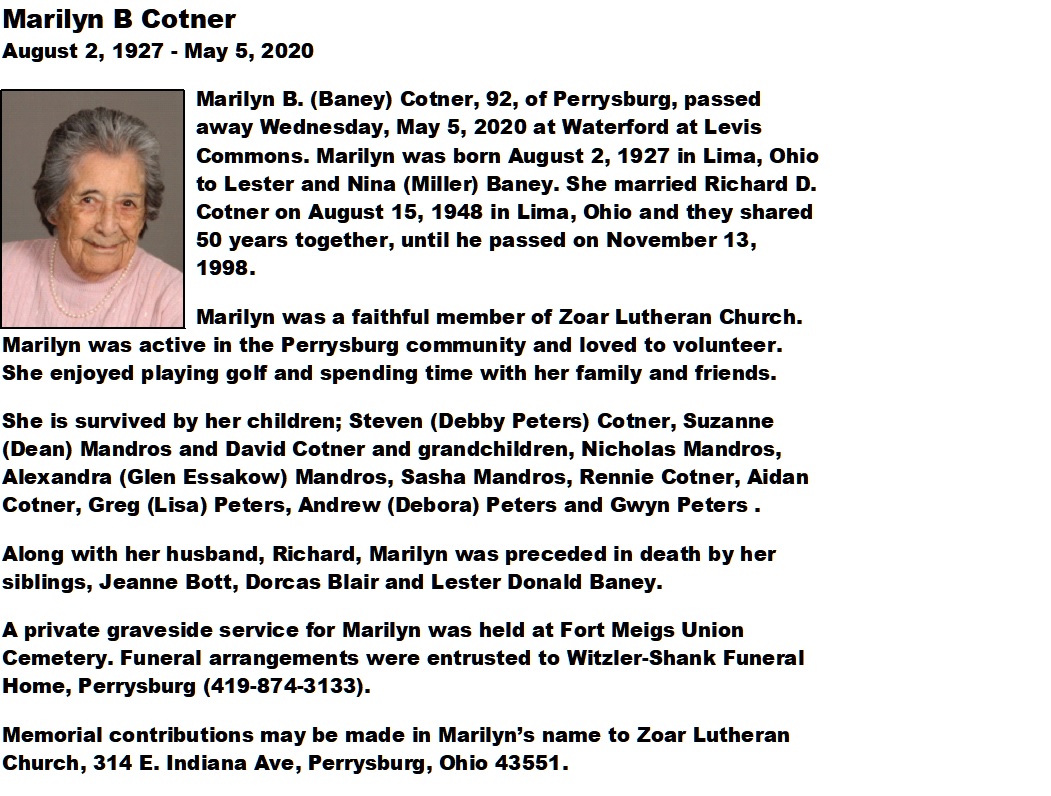 Cotner, Marilyn - Obituary , Witzler Shank Funeral Home, Perrysburg, OH