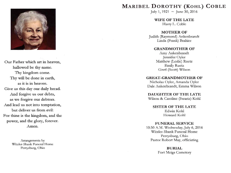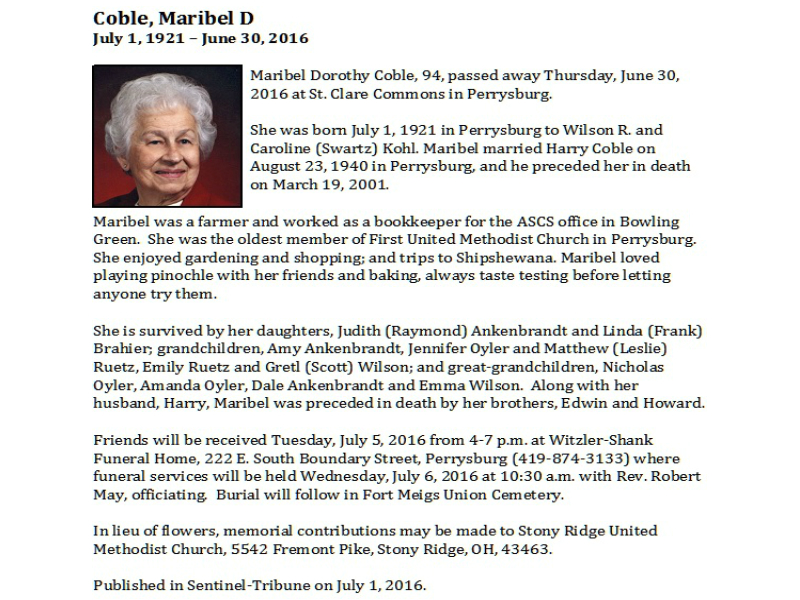 Coble, Maribel, Witzler Shank Funeral Home, Perrysburg, OH Published in Sentinel-Tribune; 07/01/2016