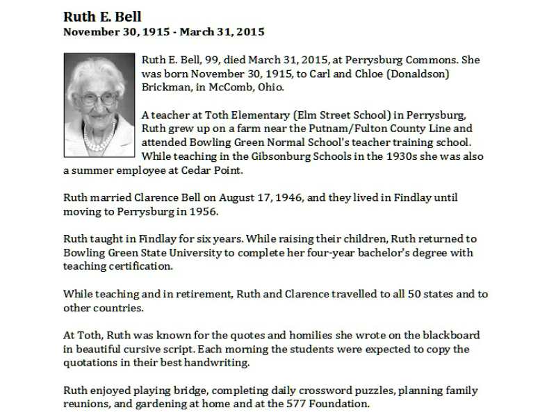 Bell, Ruth - Obituary pg 2, Witzler Shank Funeral Home, Perrysburg, OH Published in Perrysburg Messenger; 04/08/15 Published in Toledo Blade; 04/02/15