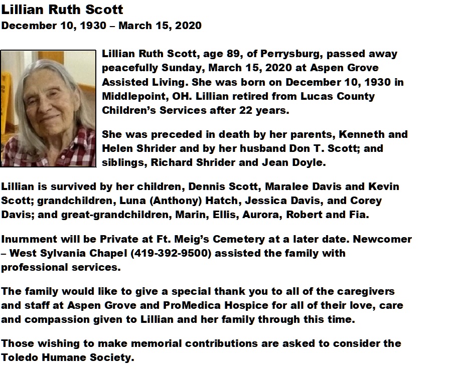 Scott, Lillian - Obituary, Newcomer Funeral Home - West Chapel, Toledo, OH