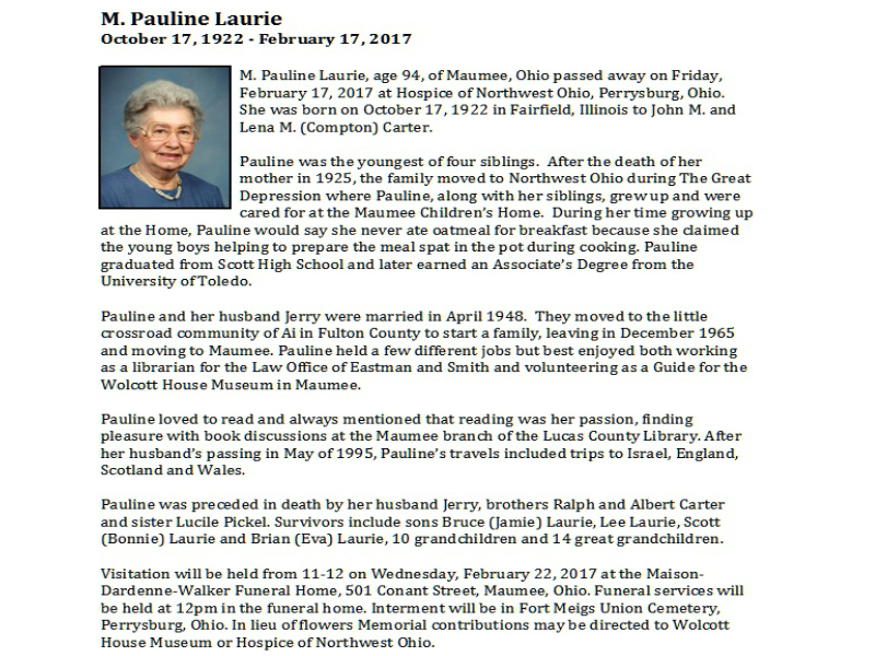 Laurie, M Pauline, Maison-Dardenne-Walker Funeral Home, Maumee, OH