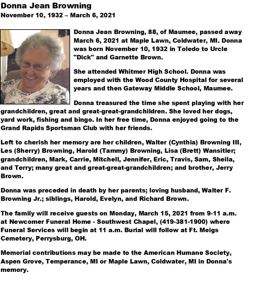Browning, Donna - Obituary, Newcomer Funeral Home SW, Toledo, OH