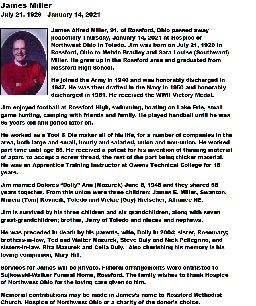 Miller, James - Obituary, Sujkowski-Walker Funeral Home, Rossford, OH
