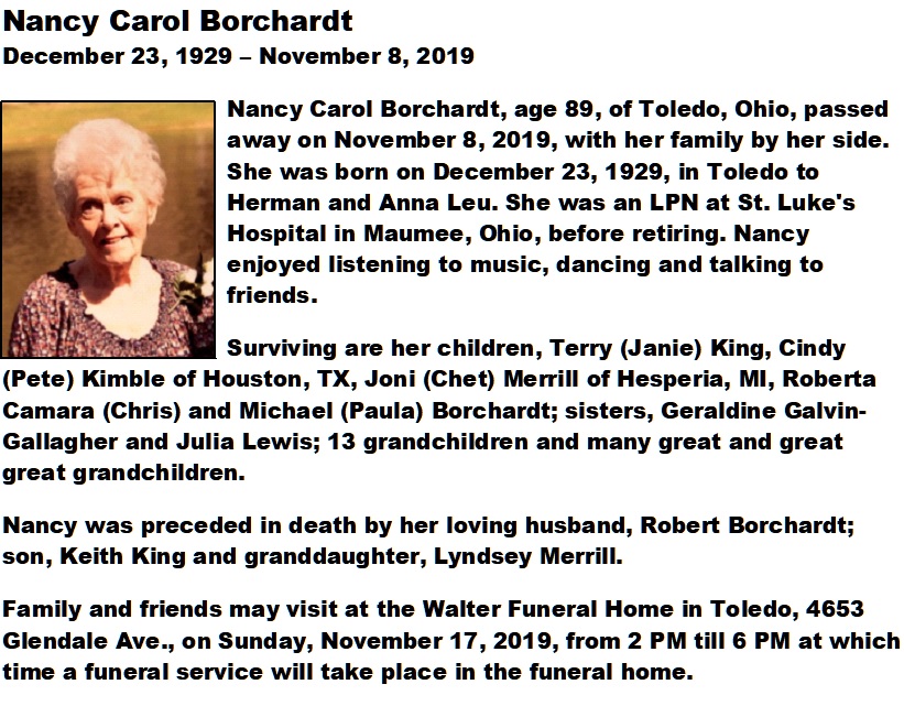 Borchardt, Nancy - Obituary, Walter Funeral Home, Toledo, OH