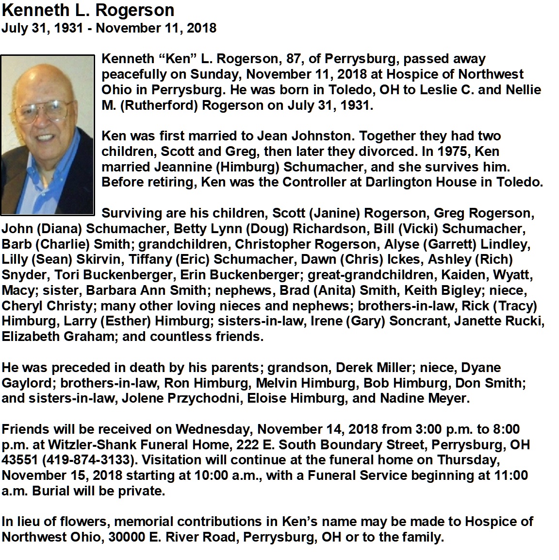 Rogerson, Kenneth - Obituary, Witzler Shank Walker Funeral Home, Perrysburg, OH