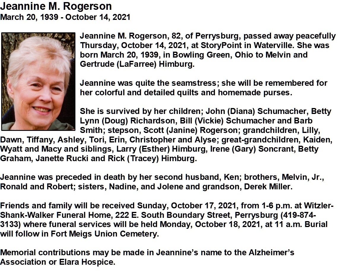 Rogerson, Jeannine - Obituary, Witzler Shank Walker Funeral Home, Perrysburg, OH 43551