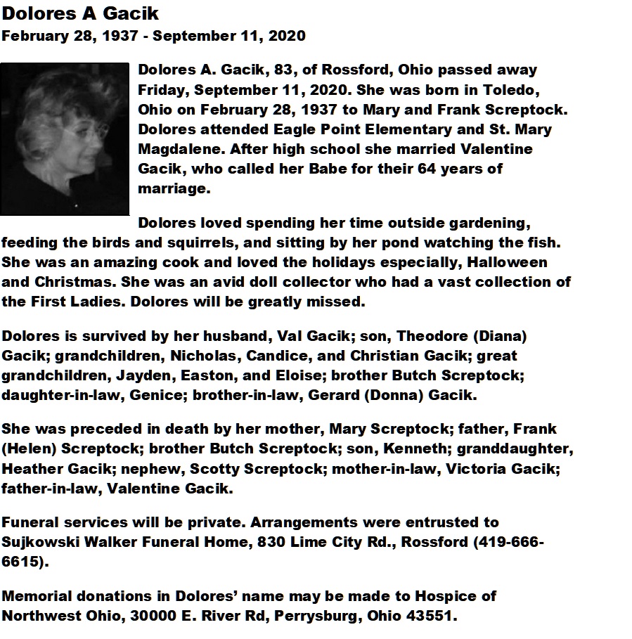 Gacik, Dolores - Obituary, Sujkowski Walker Funeral Home, Rossford, OH