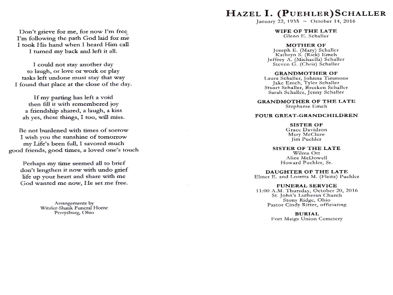 Schaller, Hazel - Remembrance Card, Witzler Shank Funeral Home, Perrysburg, OH