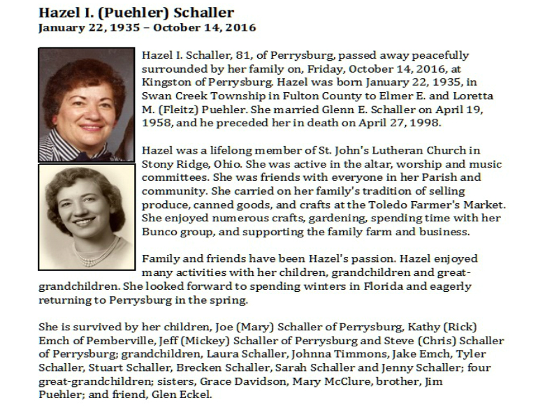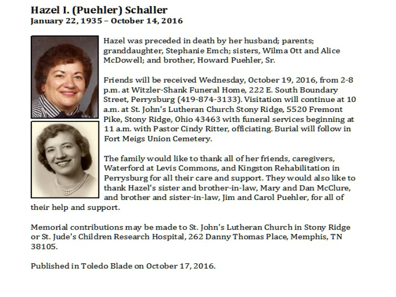 Schaller, Hazel - Obituary pg 2, Witzler Shank Funeral Home, Perrysburg, OH Published in Toledo Blade; 10/17/2016