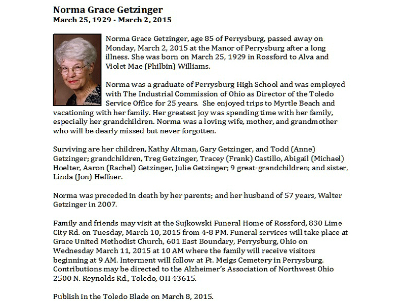 Getzinger, Norma, Sujkowski Funeral Home, Rossford, OH Published in Toledo Blade; 03/08/2015