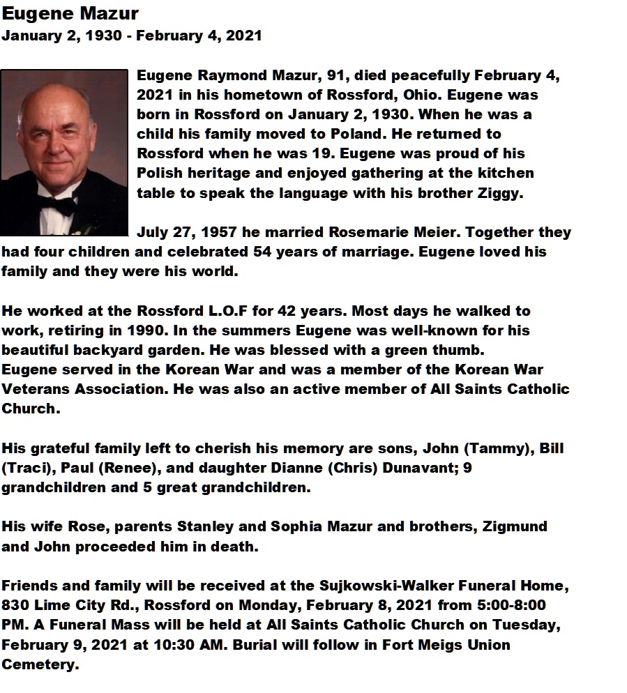 Mazur, Eugene - Obituary, Sujkowski-Walker Funeral Home, Rossford, OH
