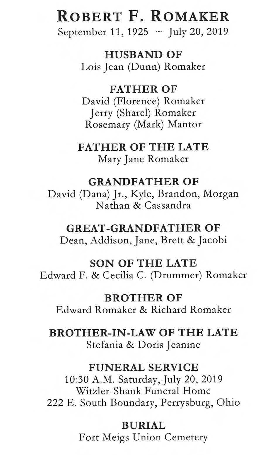 Romaker, Robert - Obituary, Witzler Shank Funeral Home, Perrysburg, OH