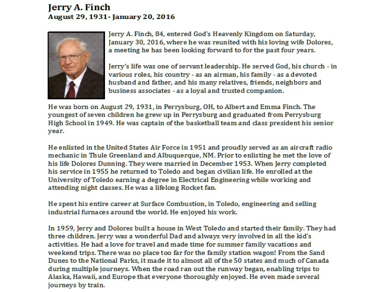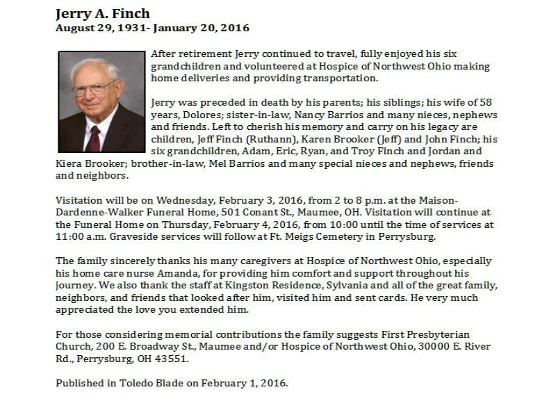 Finch, Jerry - Obituary pg 2, Maison-Dardenne-Walker Funeral Home, Maumee, OH Published in Toledo Blade; 02/01/2016