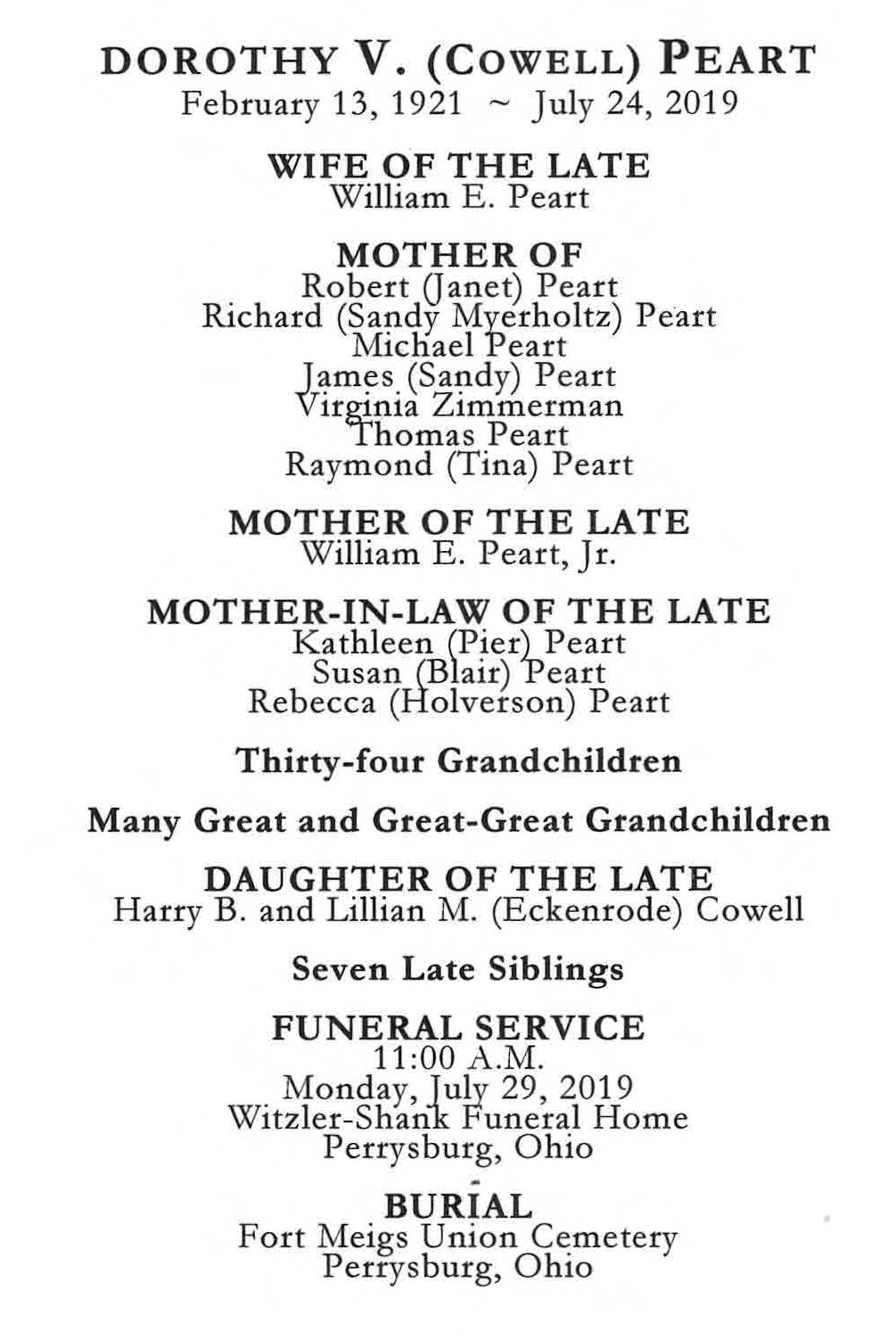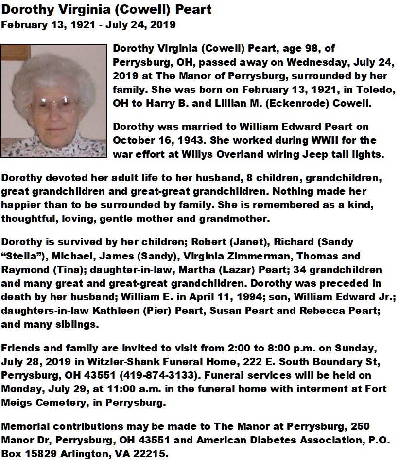 Peart, Dorothy - Obituary, Witzler Shank Funeral Home, Perrysburg, OH