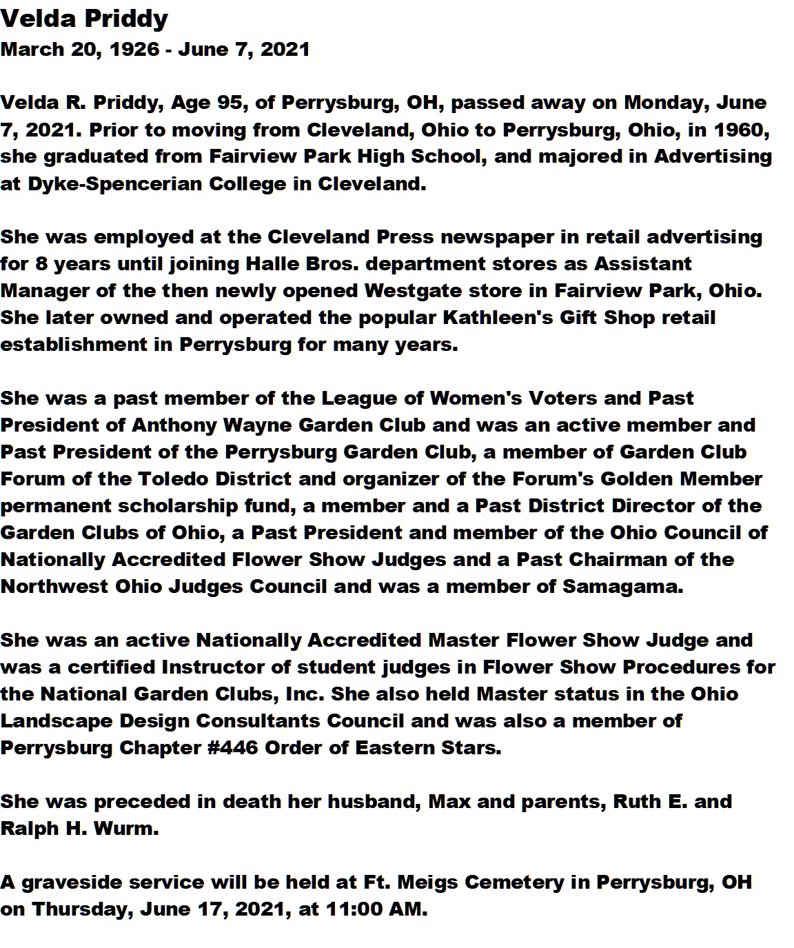 Priddy, Velda - Obituary, Maison Dardenne Walker Funeral Home, Maumee, OH