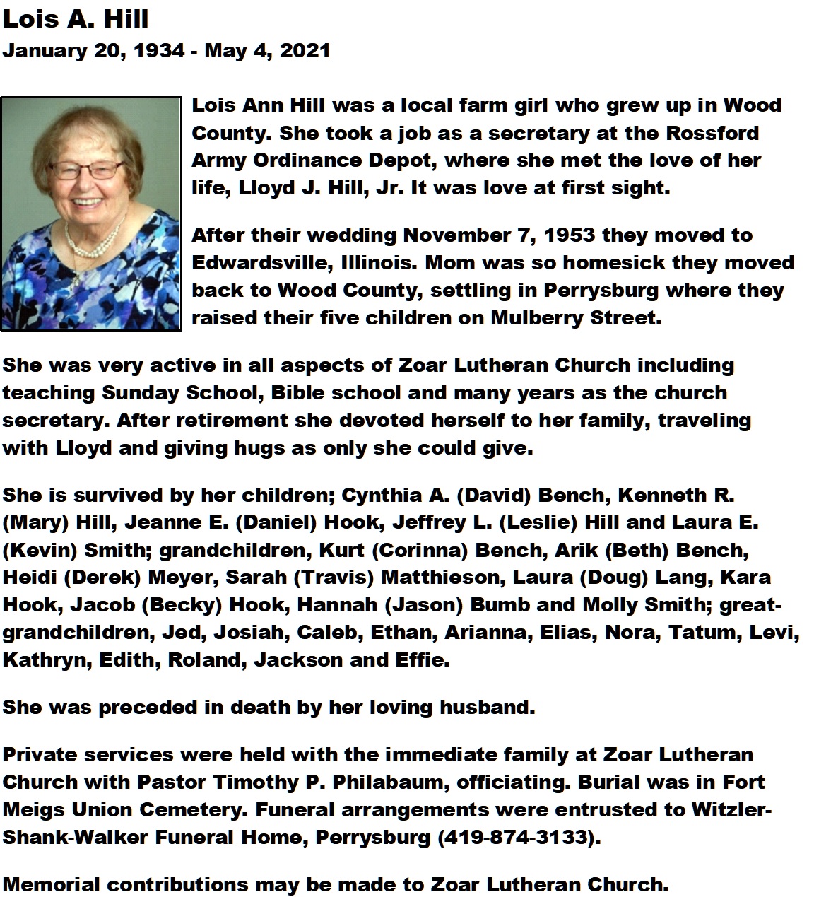 Hill, Lois - Obituary, Witzler Shank Walker Funeral Home, Perrysburg, OH