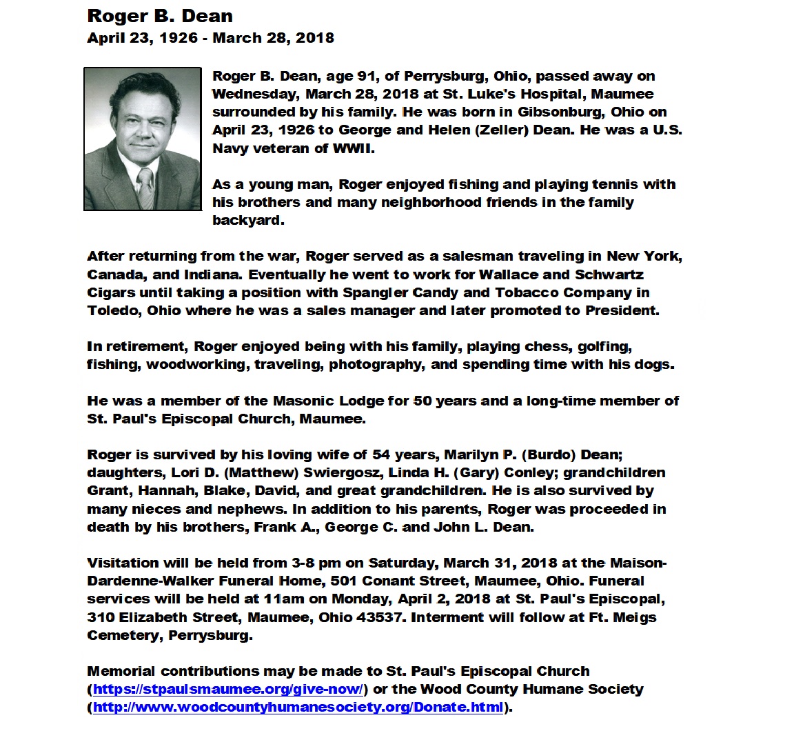 Dean, Roger, Maison-Dardenne-Walker Funeral Home, Maumee, OH