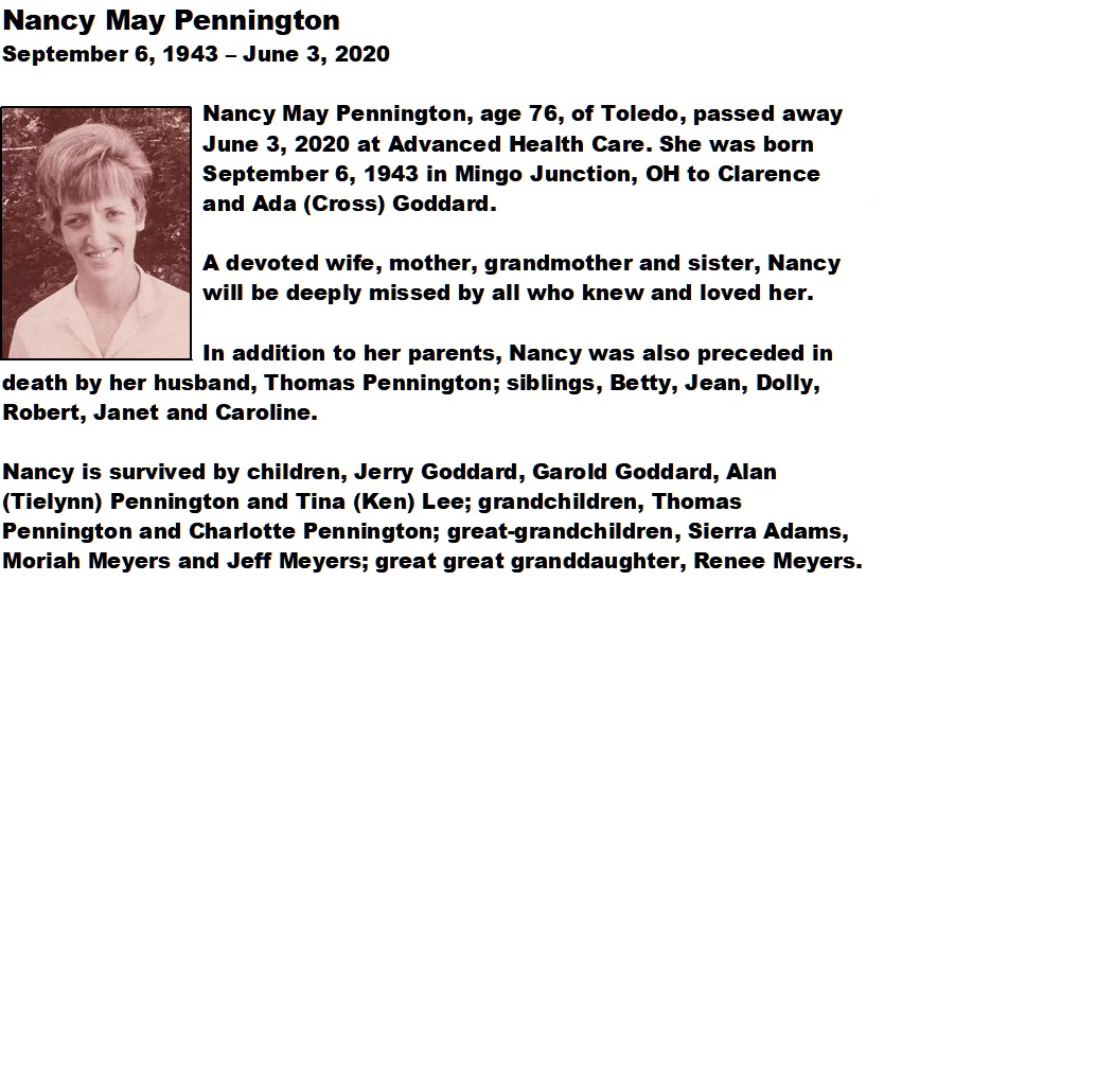 Pennington, Nancy M - Obituary, Newcomer Funeral Home, Toledo, OH