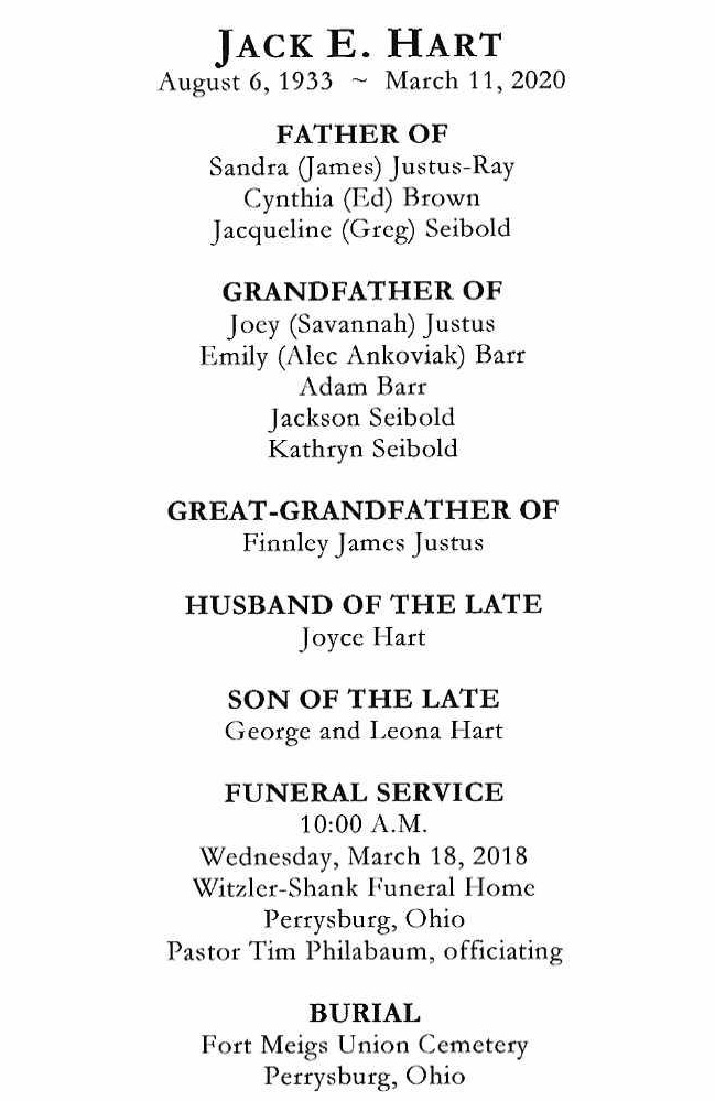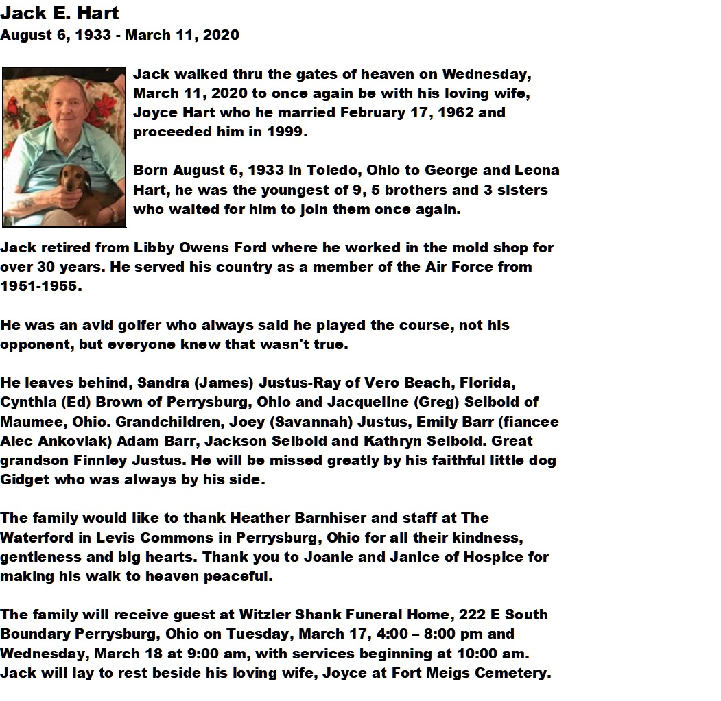 Hart, Jack - Obituary, Witzler Shank Funeral Home, Perrysburg, OH