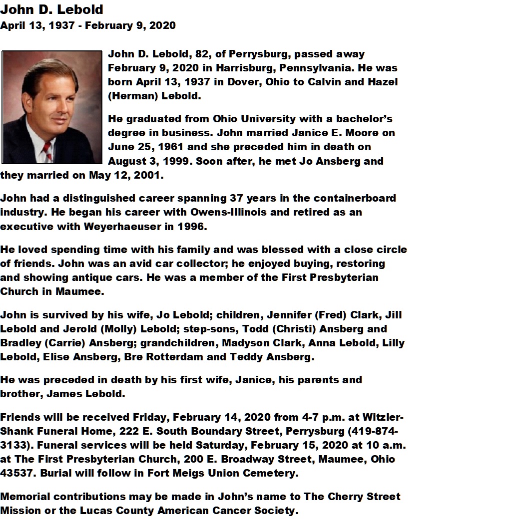 Lebold, John - Obituary, Witzler Shank Funeral Home, Perrysburg, OH