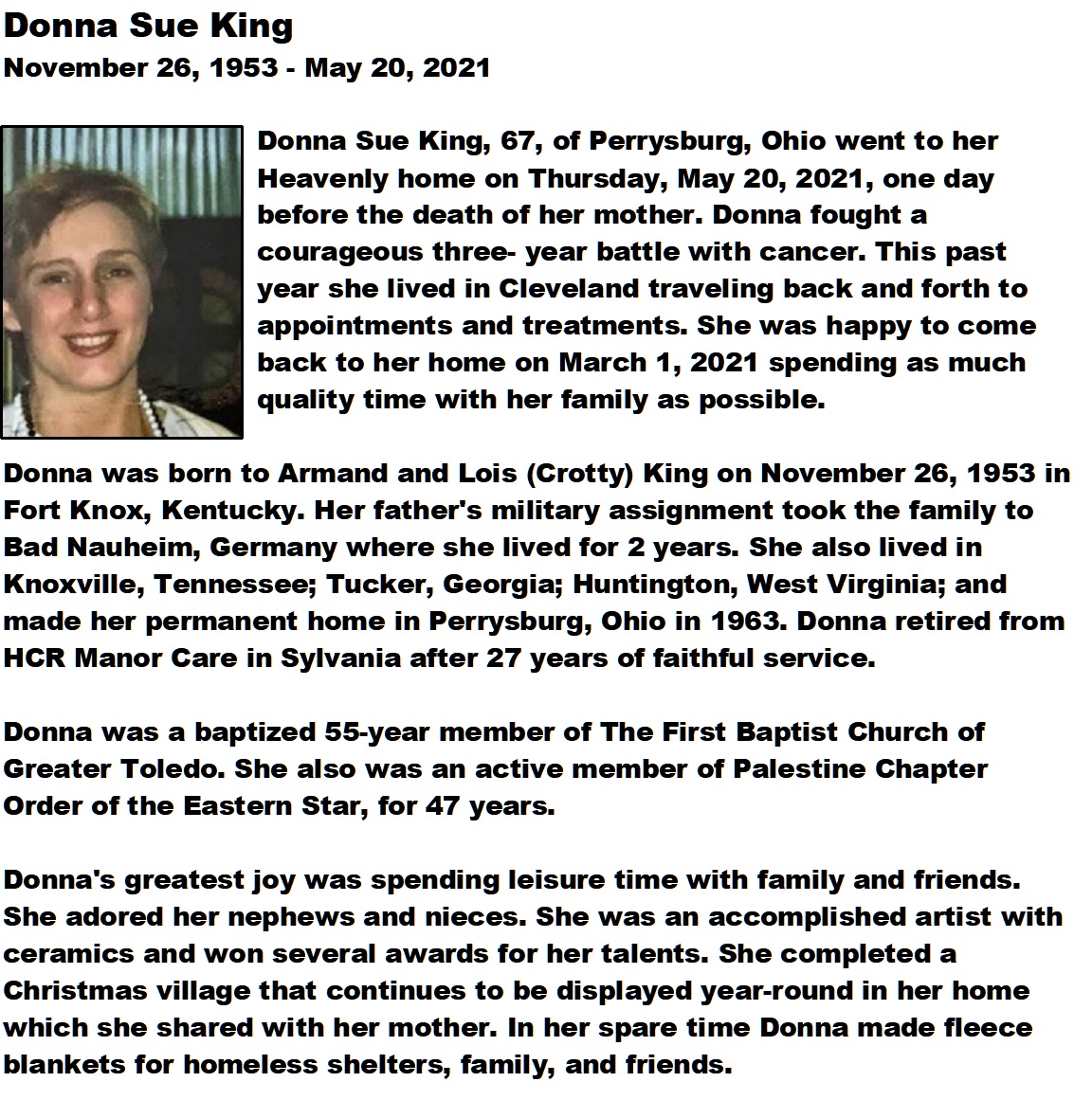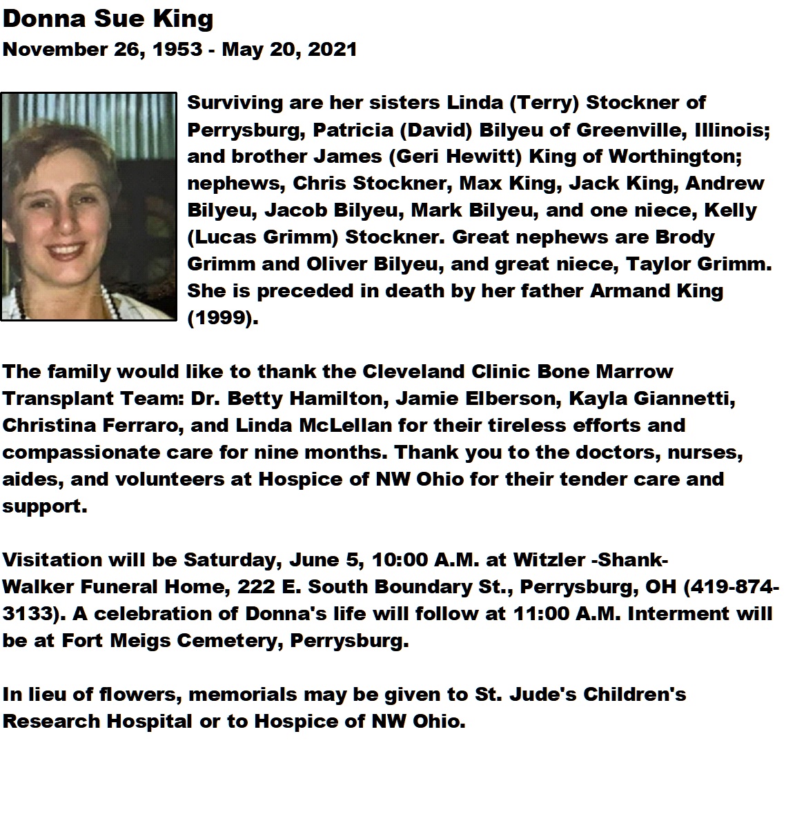 King, Donna - Obituary pg 1, Witzler Shank Walker Funeral Home, Perrysburg, OH