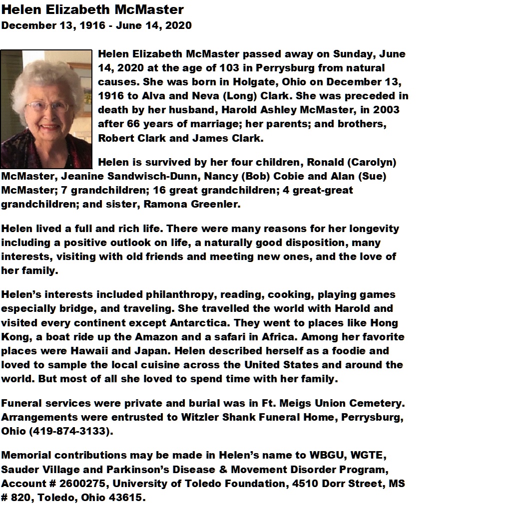 McMaster, Helen - Obituary, Witzler Shank Funeral Home, Perrysburg, OH