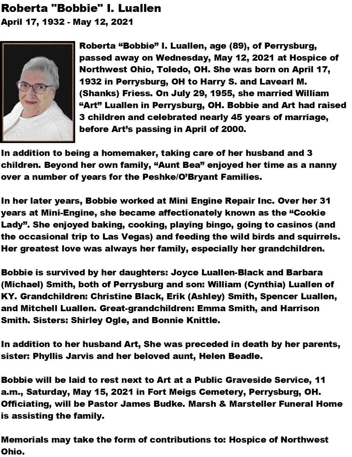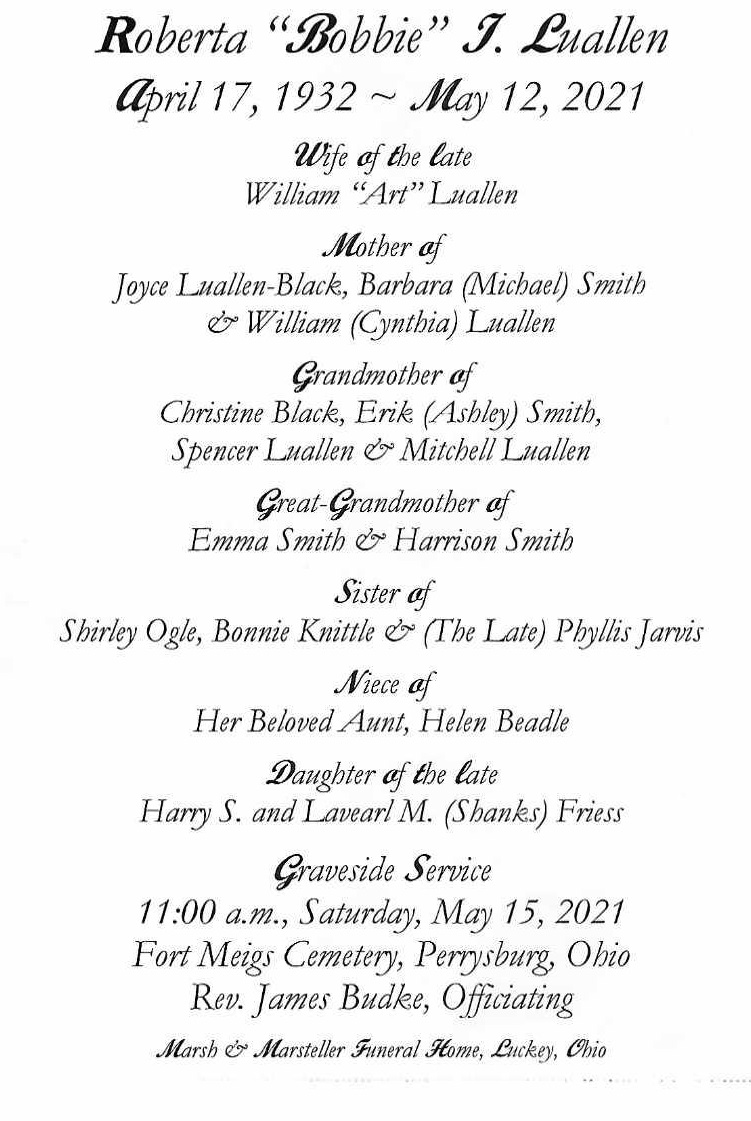 Luallen, Roberta - Obituary, Marsh & Marsteller Funeral Home, Luckey, OH